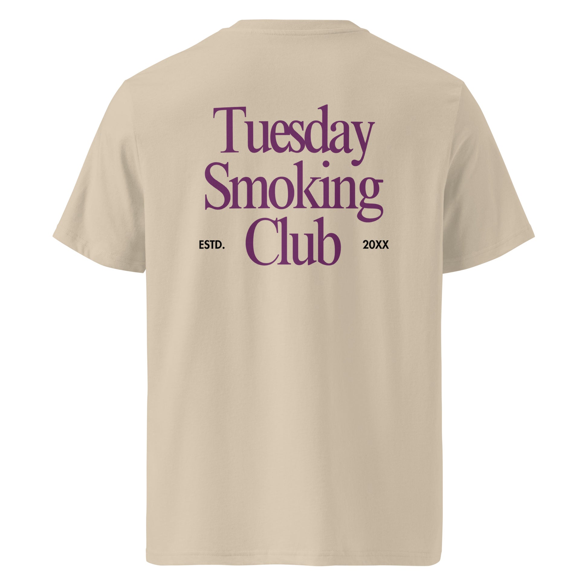Featuring a minimalist PURPLEFARM logo chest print on the front and a bold Tuesday Smoking Club graphic on the back, this Desert Dust colourway is equal parts subtle and standout. It’s a nod to your favourite day of the week — and the community that makes it better.